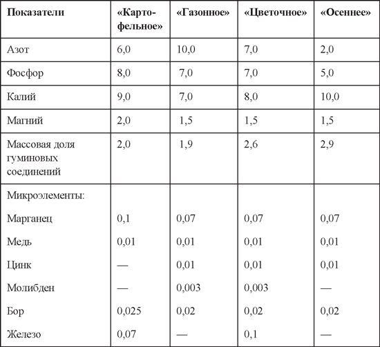 Удобрение «Универсальное» можно использовать на всех культурах, но Буйский химический завод выпускает органоминеральные удобрения и для различных культур. Данные (в %) о составе таких удобрений сведены в следующую таблицу (на стр. 57).