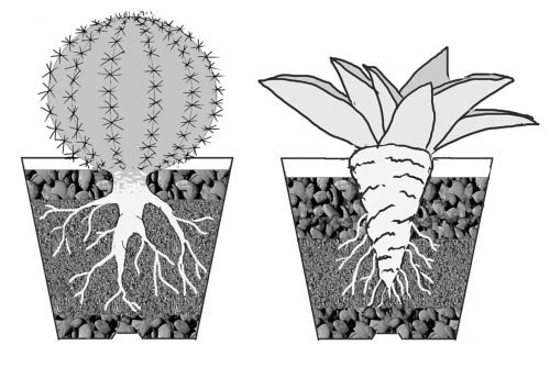 Вряд ли можно согласиться с В.Д. Лобко (1984), предлагающим сажать кактусы в узкие и высокие горшки, размер которых в поперечном сечении много меньше стебля растения. В такой посуде кактусы легко залить, а пересадка превратится в муку: попробуйте насыпать почву в горшок, закрытый кактусом. Гораздо лучше для кактуса и его владельца, если вокруг стебля до края горшка остается свободное пространство для роста стебля и удобного полива. В любом случае определяющим критерием выбора размера посуды под пересадку является величина корневой системы растения.