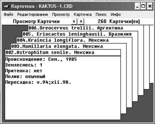 В картотеке указывают также используемую для данного вида землесмесь. Применяемые смеси условно можно пометить номерами, которые и указывают необходимость притенения. Обязательно указывают, как надо поливать. Для этого вполне достаточно двух градаций: «Полив обычный» (корни растений не боятся полной влагоемкости почвы) и «Полив умеренный» – для остальных видов. Неплохо ввести графу «Цветение», не столько ради того, чтобы ежегодно фиксировать количество цветков, сколько ради установления возраста начала цветения. И наконец, важная графа «Пересадка». Без записей в этой графе невозможно будет установить время очередной замены почвы у кактусов. Размер карточек может быть любой. Для хранения картотеки подойдет коробка подходящего размера. Если есть компьютер, можно вести электронную картотеку (рис. 9). Программа, обслуживающая картотеку, позволяет распечатывать отдельные карточки на бумаге. Электронная картотека дает возможность вести быстрый поиск нужной карточки по заданному шаблону или ключевому слову (названию вида). Желательно иметь дубликат электронной картотеки на отдельном компакт-диске, на случай отказа компьютера.